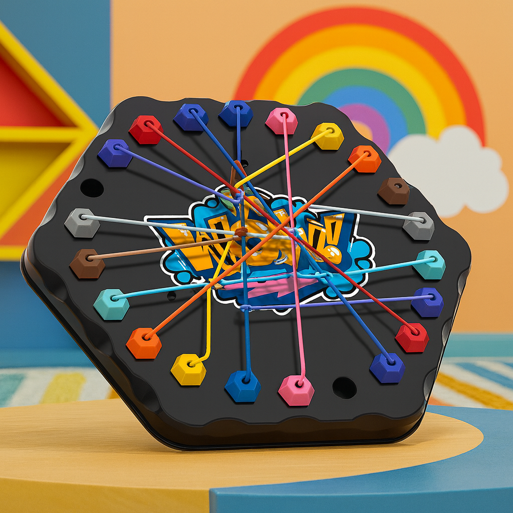 Innehåll: 1 Spelplan, 10 snören, 1 förvaringspåse
